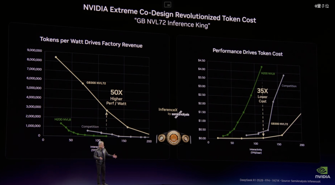 因为每座数据中心的功率都是物理约束,一座1GW的AI工厂永远不会变成2GW。在固定功率下,谁的每瓦token产出更高,谁的token成本就更低。