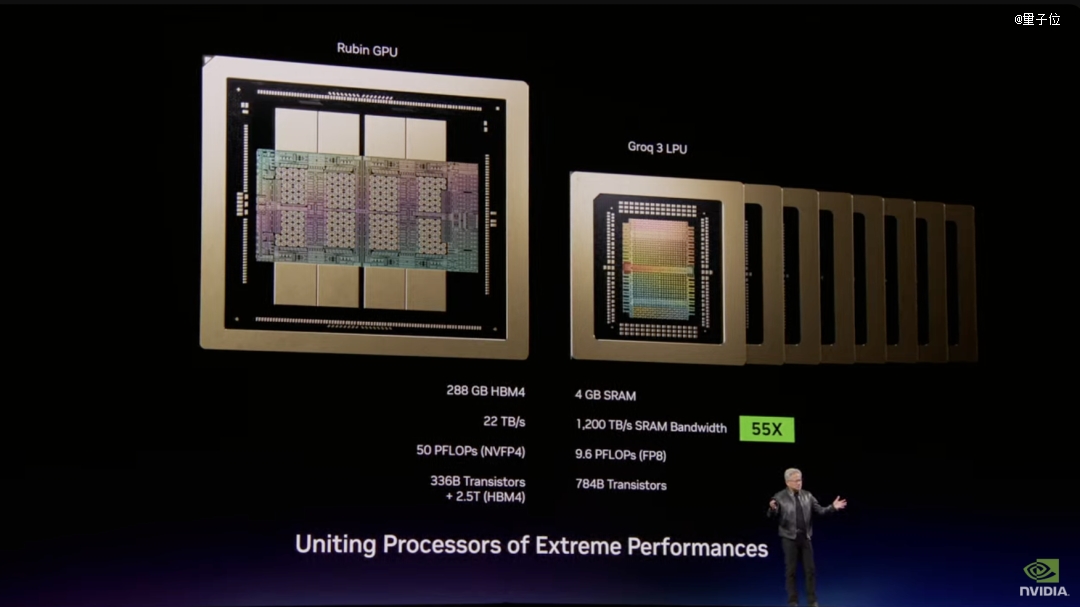 一颗Groq芯片4GB SRAM,一颗Rubin芯片288GB HBM。