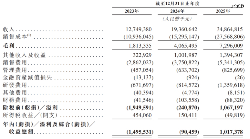 凭借于此,岚图汽车的业绩也水涨船高。招股书显示,岚图汽车在2023年、2024年及2025年,分别实现收入127.49亿元、193.60亿元及人民币348.65亿元。相对应的,2023年岚图汽车净亏损14.96亿元,并于2025年转亏为盈,净利润为10.17亿元。
