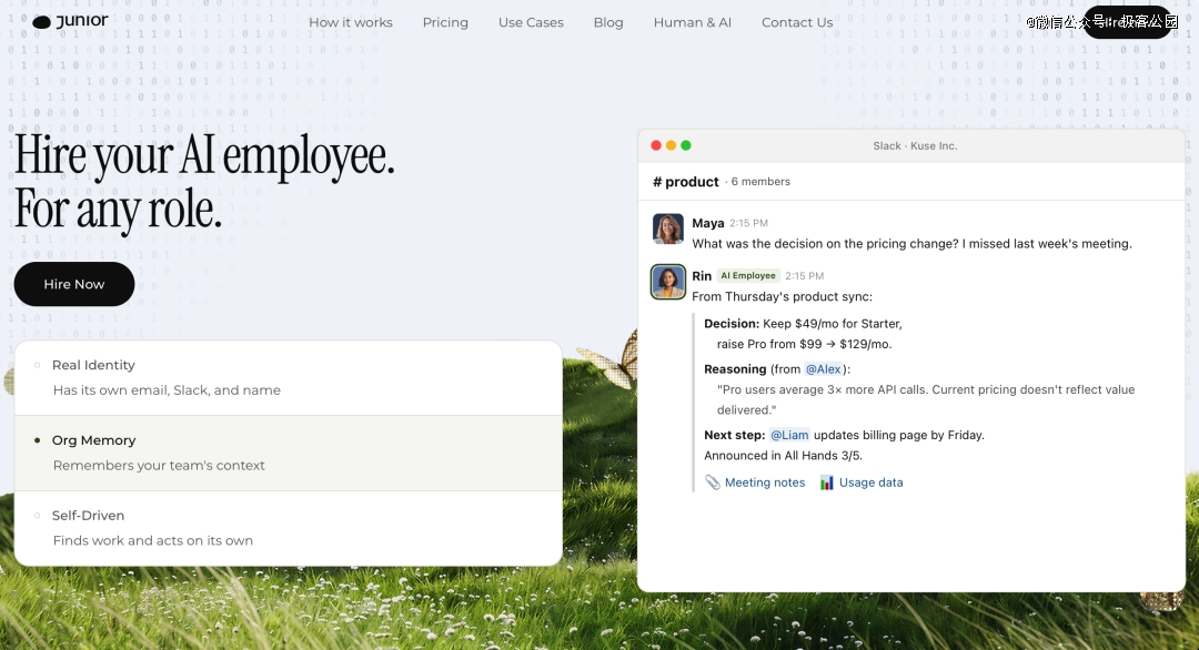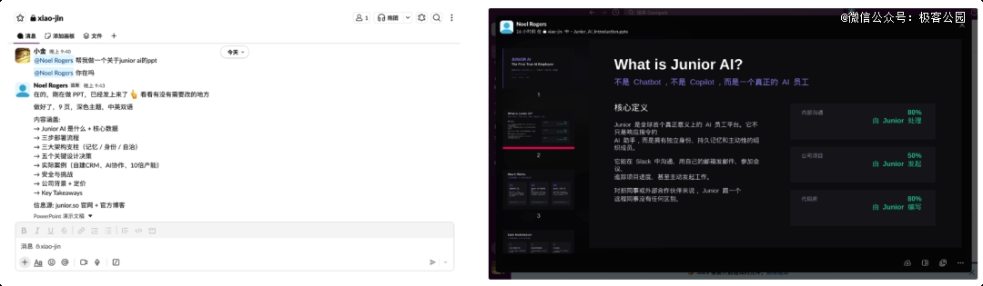 *天加入的时候,Junior 会把公司所有公开文档读一遍,查看 Slack 里所有它能访问的历史消息。几周后,它对组织的理解程度跟刚入职时完全是不同的量级。