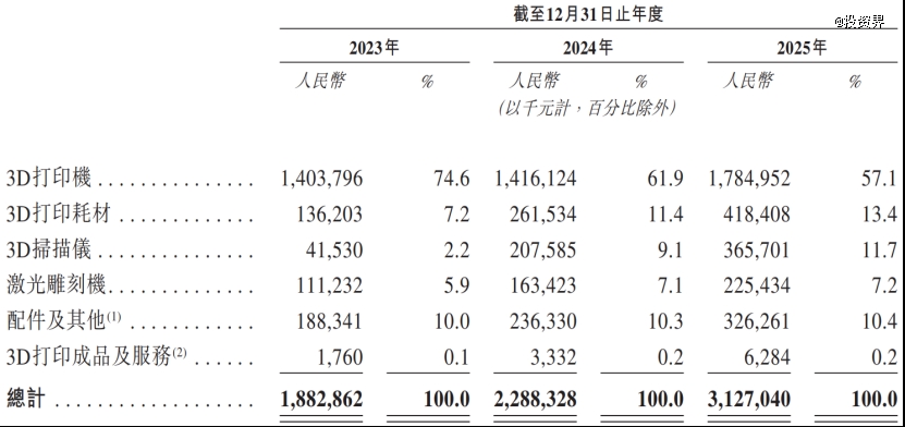 产品结构方面,3D打印机仍是公司的核心业务支柱,2025年贡献了约57.1%的营收,但占比逐年下降,3D打印耗材、3D扫描仪则纷纷提升到了10%以上。