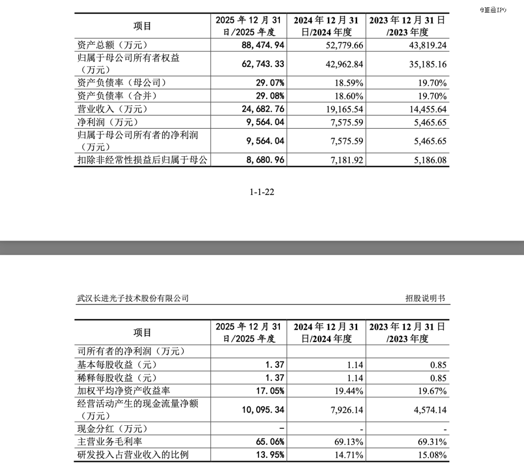综合多份招股书,报告期内,长进光子的营业收入分别约1.08亿、1.45亿、1.92亿、2.47亿元;净利润分别为3678.17万、5465.65万、7575.59万、9564.04万元;扣非归母净利润分别为3372.59万、5186.08万、7181.92万、8680.96万元。