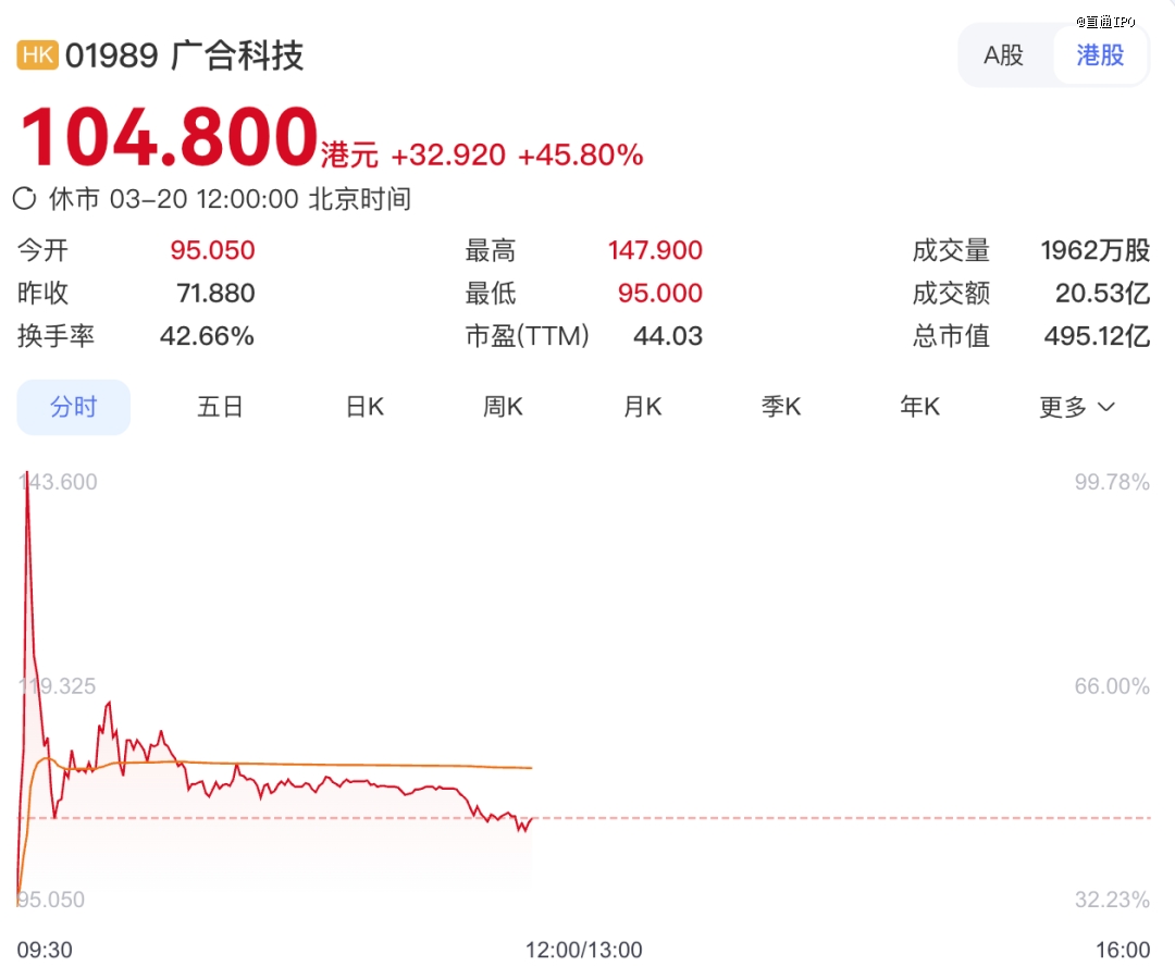 3月20日,广合科技正式在港交所主板挂牌上市,发行价为每股71.88港元,开盘涨32.23%至95.05港元,总市值450亿港元;截至午间休盘,每股涨45.8%至104.8港元,总市值495.12亿。