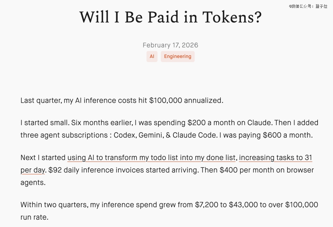 半年之内,他的AI推理支出从年化7200美元涨到4.3万美元,再到超过10万美元。