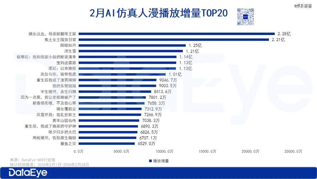 随着真人短剧的精品化,有些熟悉好用的套路反而只能舍弃,正好给AI仿真人剧捡漏。像是屡遭审判的虐女情节,官媒批评的萌宝题材,都是好用却不能再用,与漫剧形式又不太兼容,终于,AI仿真人剧让它们重新有了用武之地!Dataeye漫剧2月月榜TOP3的《嫡女泣血,母亲掀翻帝王家》就以女主捡到了一个被虐成人彘的乞丐,洗干净后发现是她那嫁入王府的女儿为开头。