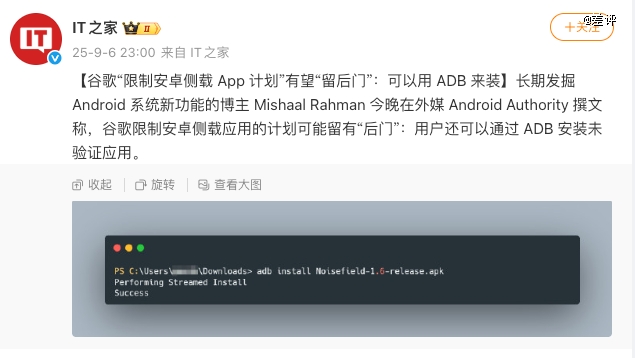 与此同时,谷歌也没有把所有非官方安装路径一刀切地砍掉。至于开发调试、企业内部分发,以及业余爱好者的小范围分享,官方还是留了口子 ——