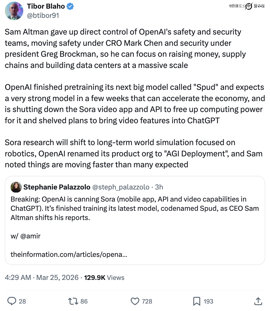 OpenAI已完成其下一代大型模型“Spud”的预训练,预计在几周内推出一款性能很强的模型。正是为了为这款新模型腾出算力资源,OpenAI决定关停Sora,同时搁置将视频功能接入ChatGPT的相关计划。