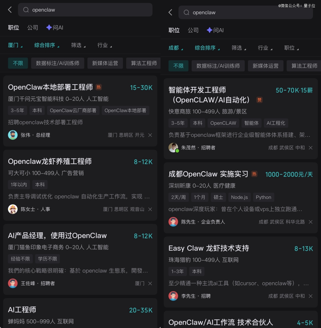 随便打开一个招聘网站一搜,你别说,你还真别说,「OpenClaw」标签下的在招岗位真是不少: