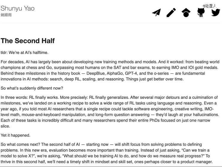 他的这篇文章必然会被拿来与已经掌管起腾讯模型的姚顺雨一年前那篇《AI下半场》做对比,而对于一个复杂系统的执迷以及过去直接在最顶端操盘一整个大规模复杂系统的直接经验,可能是这两篇文章里体现思路上*的不同。