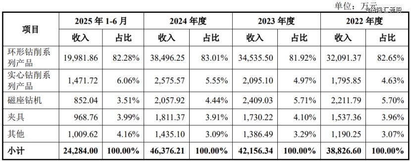 具体来看,2022年、2023年、2024年、2025年1-6月(简称“报告期”),欣兴工具80%以上的收入来自环形钻削系列产品。
