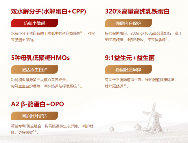 海普诺凯深耕婴幼儿营养领域多年,始终将全面营养作为科学喂养的核心准则,依托品牌雄厚的科研焕新实力,持续优化海普诺凯1897荷致“母源全面营养”配方。奶粉搭载荷兰专利A2β-酪蛋白+OPO组合,提供温和的营养支持。针对季节交替等敏感时期的守护需求,荷致配方中的全面自护营养群,强化添加高量乳铁蛋白、5种母乳低聚糖HMOs、免疫球蛋白IgG、乳源燕窝酸和9:1益生元+益生菌,复刻亲喂里的活性自护营养,有助于提升宝宝身体自护力,为发育期宝宝铸就强健好体质。同时,配方中优量添加的水解小分子蛋白+生物活性肽CPP,有助于提高关键营养吸收速度,让奶粉营养被充分利用,全方位守护宝宝茁壮成长。
