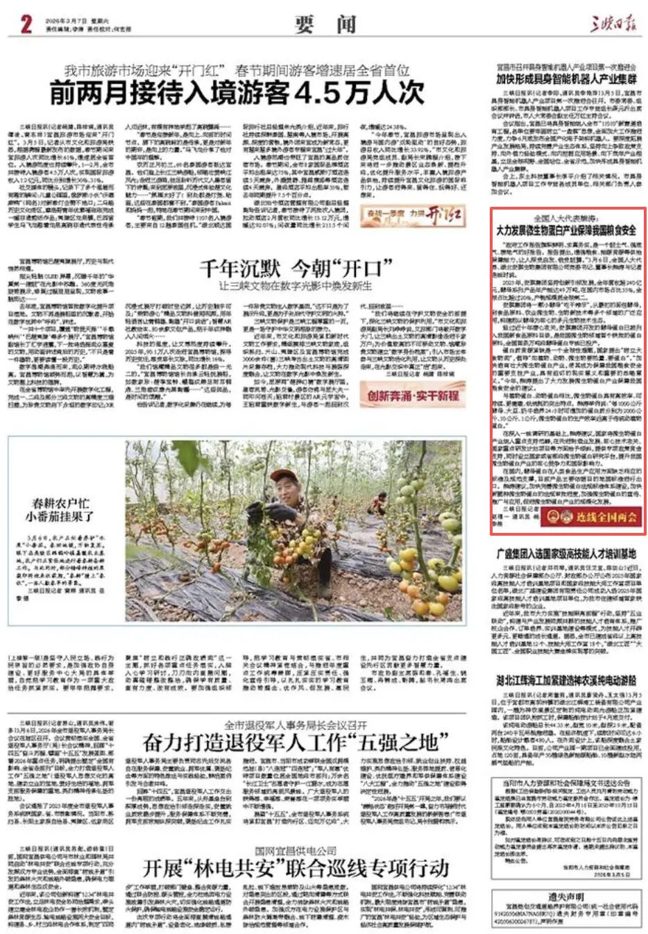 “政府工作报告旗帜鲜明、求真务实,是一个鼓士气、强底气、接地气的好报告。报告提出,增强粮食、能源资源等供给保障能力,让人深受启发、倍受鼓舞。”3月6日,全国人大代表、湖北安琪生物集团有限公司党委书记、董事长熊涛与记者连线时说。