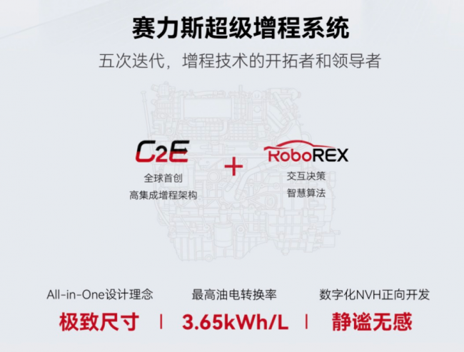 全新一代赛力斯超级增程系统,基于“赛翼(C2E)增程架构”与“RoboREX智能控制技术”赋能,具备静谧无感、高集成度、超高效率三大行业*优势。“赛翼增程架构”采用All-in-ONE一体化设计理念,实现发动机与电机深度集成,控制系统集成,壳体集成,从而达到*尺寸与成本控制。“RoboREX智能控制技术”颠覆性地改变了增程器的工作方式,由被动工作变成主动工作,实现智能主动能量管理。