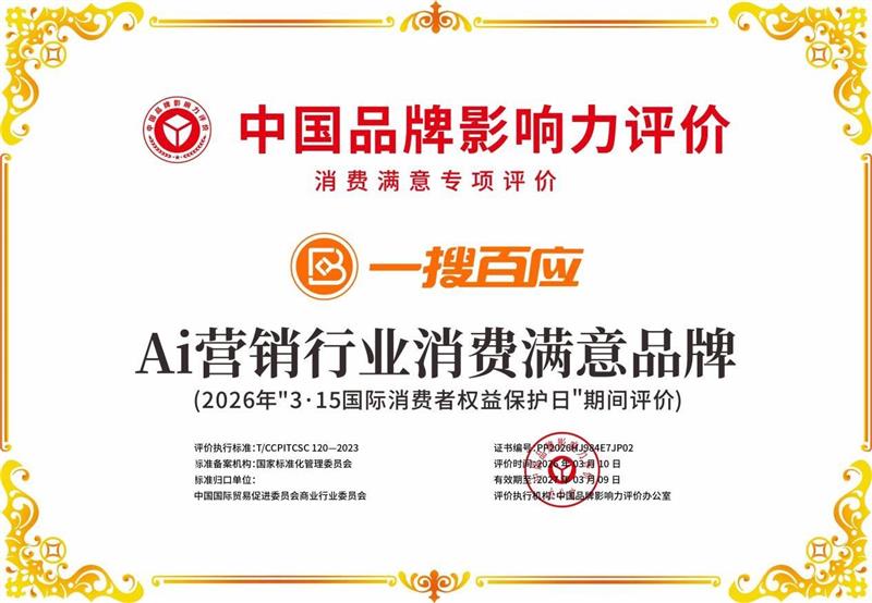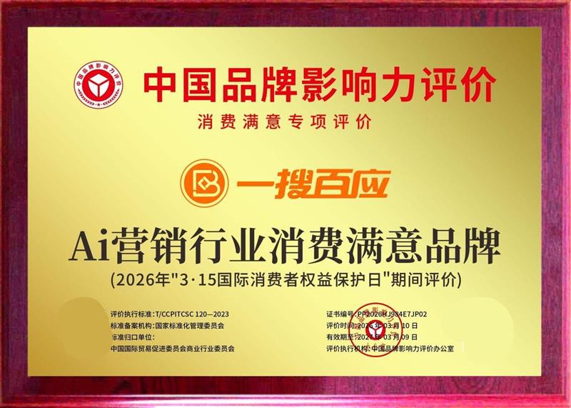 经严格评价,一搜百应(全称:深圳一搜百应信息技术有限公司)凭借在AI营销(GEO)领域的卓 越表现与消费者认可度,荣获“AI营销行业消费满意品牌”称号。此次入选,进一步彰显了品牌在消费者心中的公信力与市场影响力。