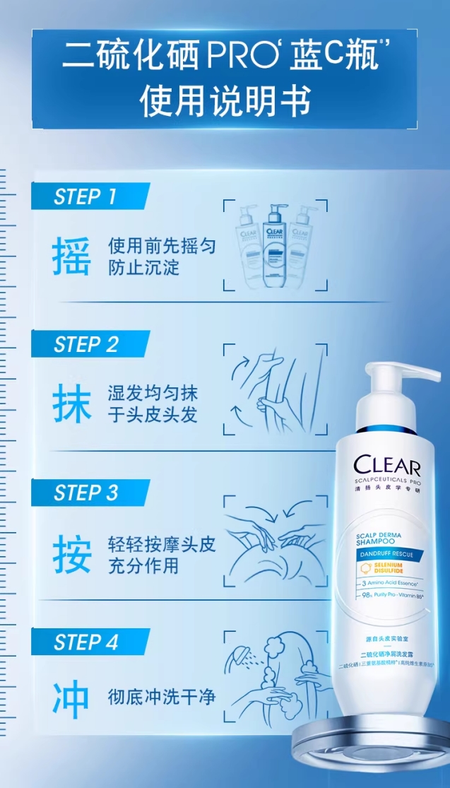 想要发挥二硫化硒的最 大功效,使用方法也很关键。清扬二硫化硒蓝C瓶的使用方法建议如下: