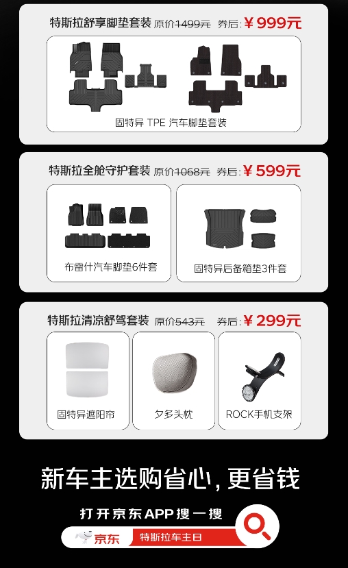 活动期间,广大车主在京东APP搜索“特斯拉品类日”,完成车辆信息绑定后,即可领取专属礼券。三大特斯拉专车定制用品套装全面适配全系车型,优惠力度也*诚意:特斯拉舒享脚垫套装包含固特异TPE汽车脚垫,环保耐用,*贴合原车,原价1499元,专属活动价仅999元;特斯拉全舱守护套装包含布雷什汽车脚垫与固特异后备箱垫,实现车内全空间防护,原价1068元,专属活动价低至599元;特斯拉清凉舒驾三件套包含夕多头枕、ROCK车载磁吸手机支架、固特异遮阳挡,兼顾舒适与实用,原价543元,专属价仅299元。