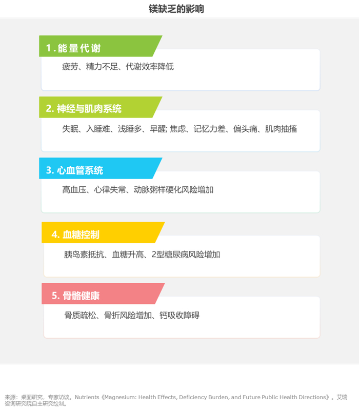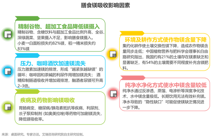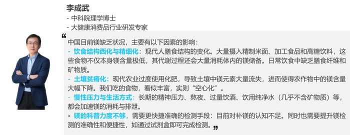 - 饮食结构西化与精细化、土壤贫瘠化、慢性压力与生活方式、镁的科普力度不够是影响镁流失和镁缺乏的主要因素。