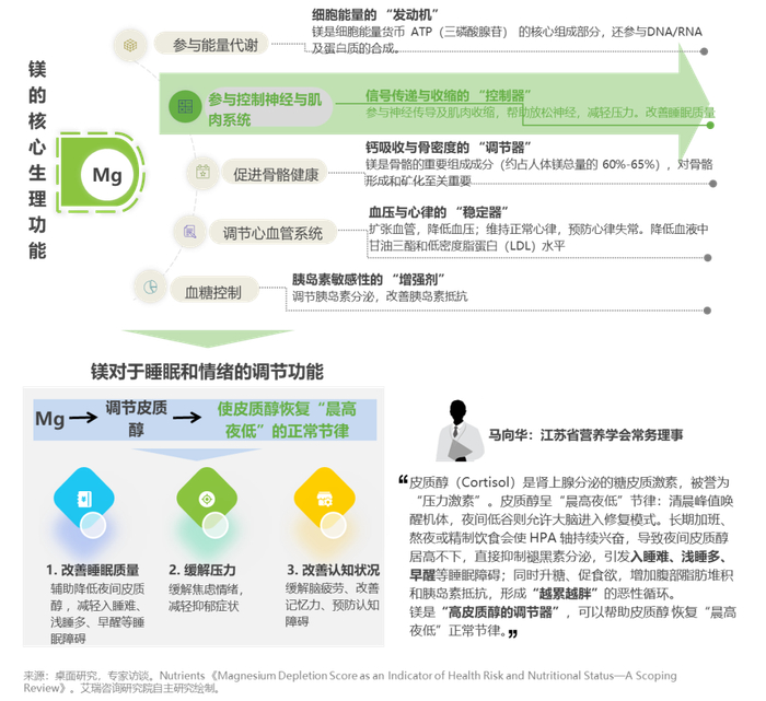 - 镁是调节能量代谢、改善情绪与认知、维护心血管健康等数百种酶促反应的重要辅因子。人体镁主要通过肠道吸收、肾脏重吸收与排泄、骨组织镁转换进行生理调节。