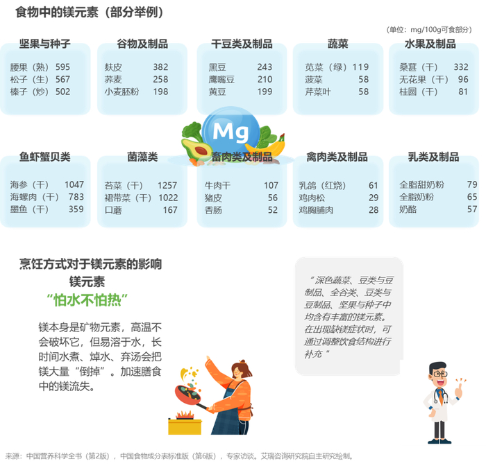 - 中国居民日常饮食中高镁食物出现频率较低,烹饪时亦需关注“水少、火短、连汤吃”的留镁方式,减少食物中的镁流失。补镁同时需要关注镁与钙、铁、维生素等其它元素间的协同及拮抗作用。