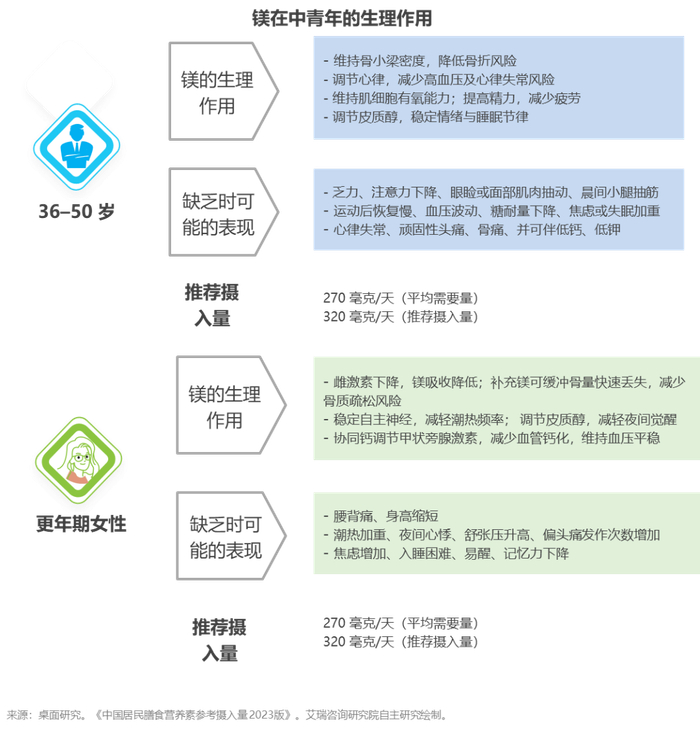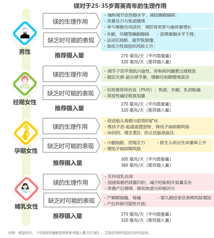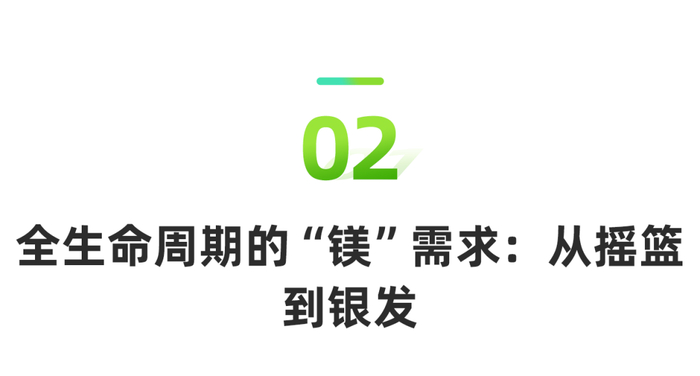 中青年属于镁需求上升期,隐性镁消耗增加,需定期检测,储备“镁力”资本。