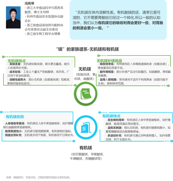 - 从吸收率、副作用等方面看,有机镁更适宜作为补镁剂进行日常补充。甘氨酸镁、苹果酸镁、牛磺酸镁、苏糖酸镁等不同有机镁的适用人群各有侧重,多种有机镁复合配比可满足更全面的补镁需求。