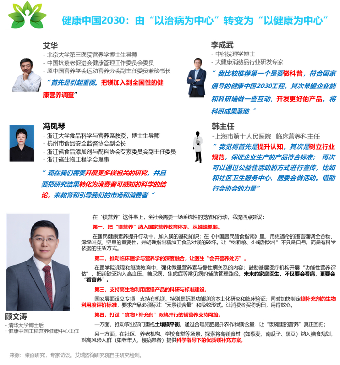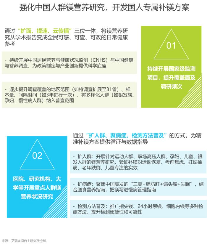 倡议与展望:在“健康中国2030”战略下,通过科普、定期监测、规范行业标准、打造“食物+补充剂”的补镁网络等多种手段,提升全民镁营养水平