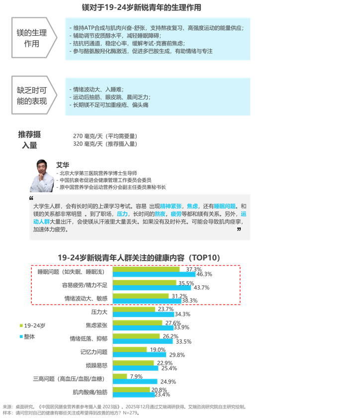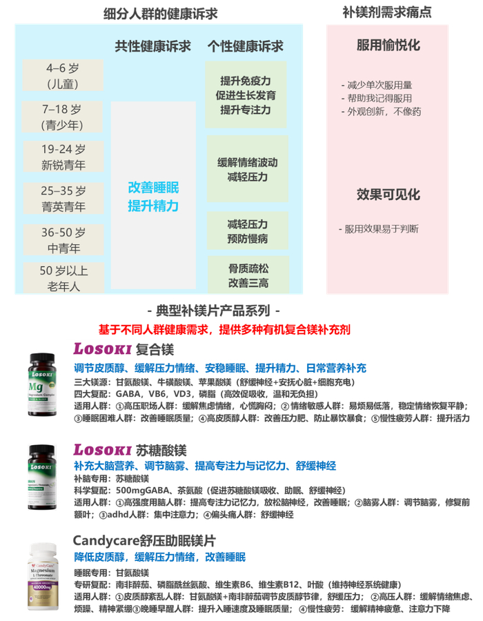 睡眠改善和精力提升是各年龄段人群共同的健康诉求。儿童、青年、中老年对于个性化补镁需求强烈