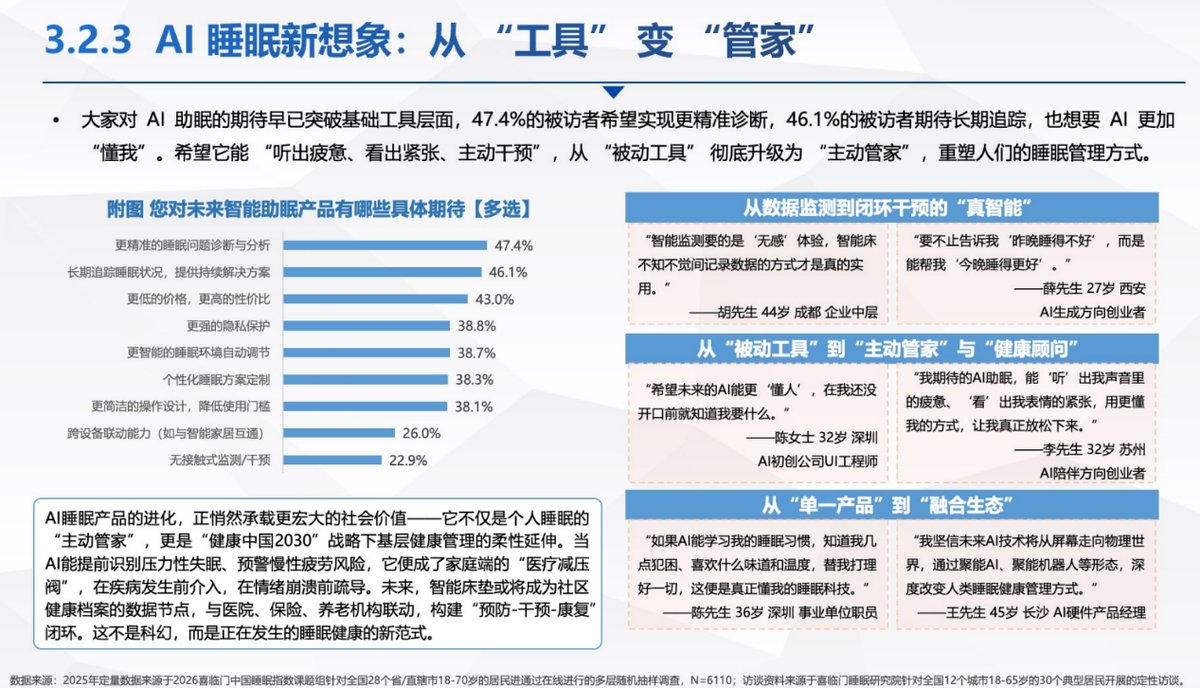 连续14年追踪国人睡眠状况的指数报告,清晰勾勒出当前国民睡眠的核心痛点:68.6%的受访者受失眠困扰,38.5%存在颈部不适,36.6%受腰部不适问题影响,超60%的伴侣会因床垫软硬需求差异相互妥协。这些数据印证了国人睡眠需求已全面升级,消费者不再满足于寝具的单一承托功能,而是期待个性化、主动式、全链路的睡眠解决方案,这也成为睡眠行业从 “材料竞争”迈入“系统解题”时代的核心驱动力。