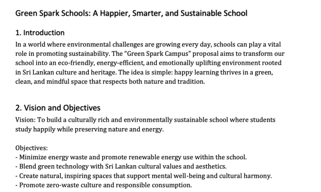作品以校园为场景,将节能系统、零废弃午餐区、太阳能学习空间融入校园环境,并巧妙结合竹材、黏土、传统音调等斯里兰卡本土文化元素。设计兼顾环境效益与情感体验,兼具可实施性与教育意义,体现了青少年对可持续校园与社区文化的深刻思考。