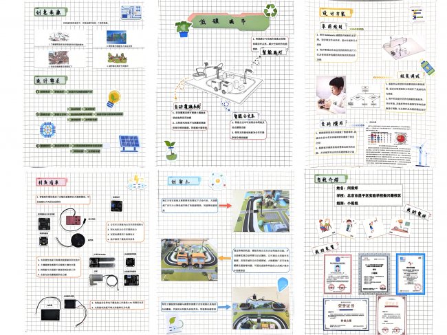 作品以“低碳未来之城”为核心构想,将交通、生活、工业、农业四大模块整合为一套高度系统化的低碳城市体系。通过立体交通与压感发电技术实现低碳减排,以太阳能智能路灯、太阳能智能灌溉系统分别提升生活与农业效能,并用沙盘模型完整呈现出这一系统化的城市蓝图,充分展现了作者对未来可持续社会的深入思考。