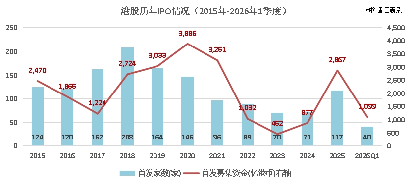 2026年一季度,港股一共迎来40只新股上市(其中岚图汽车通过介绍上市方式,未发行新股),较2025年一季度的16家增长了150%;新股首发募集资金累计约1099.26亿港元,已经超过了2022年全年的1032亿港元,更是远高于2023年和2024年全年。
