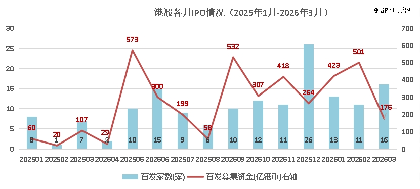 从各月的表现来看,今年1-3月IPO首发募资金额分别为423亿港元、501亿港元、175亿港元,上市新股数量分别为13家、11家、16家,均远高于去年同期。