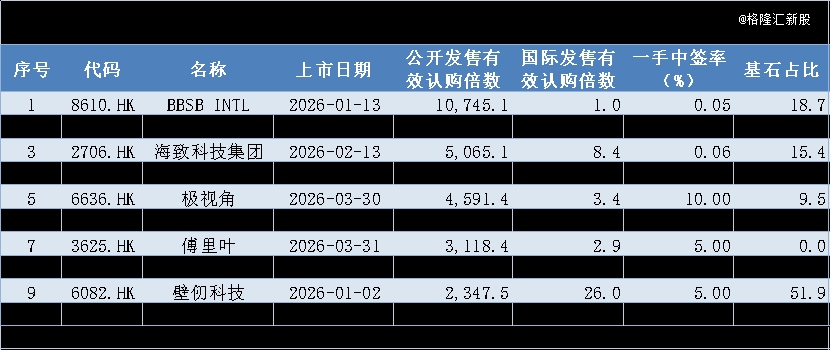 其中,BBSB INTL因为发行规模较小,公开发售有效认购倍数超过了1万倍;优乐赛共享、海致科技集团、华沿机器人的公开发售认购倍数则均超过了5000倍,热度较去年有过之而无不及。