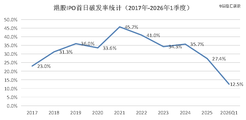 从上市首日涨跌幅表现来看,今年在港股上市的40只新股中,共33家在上市首日收涨,2家收平,5家收跌;上市首日破发率为12.5%,较2025年的27.4%进一步下降,创下了自2017年以来*的破发率。