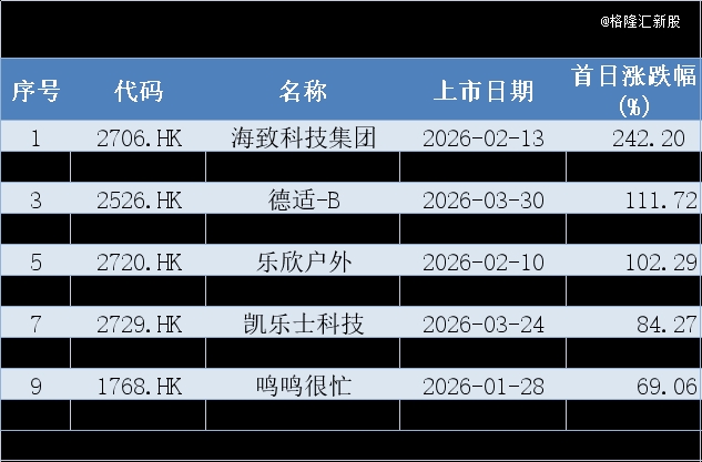 从个股表现来看,今年一季度有6家新股上市首日涨幅超过了1倍,包括海致科技集团、极视角、徳适-B、MINIMAX-W、乐欣户外、傅里叶,其中海致科技集团以242.2%的涨幅录得今年上市首日涨幅榜冠军。