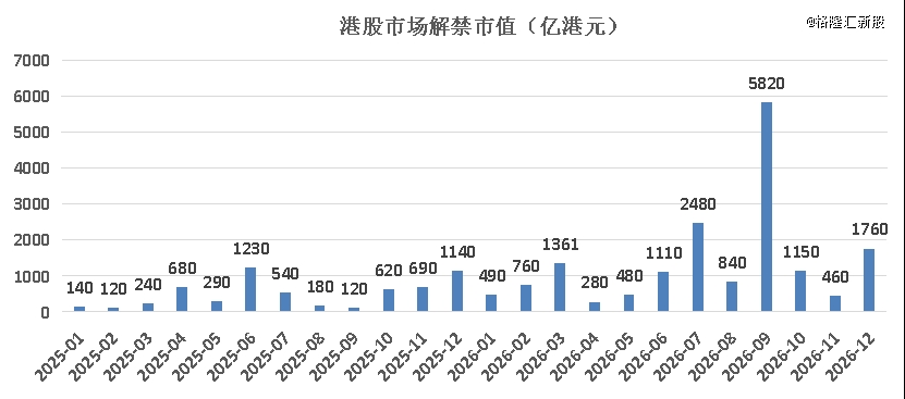 根据海通国际的数据,从时间分布来看,2026年上半年港股解禁规模预计超过4500亿港元;2026年9月预计将迎来约5816亿港元的解禁高峰窗口,主要来源为紫金黄金国际解禁市值约4955亿港元。
