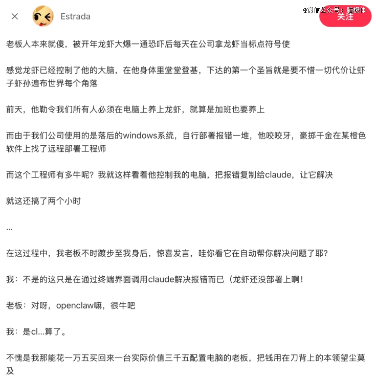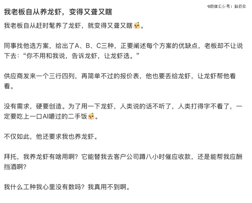 在这一刻,员工完成了双重糊弄:既用了AI工具交差,又向老板证明了自己的判断力高于龙虾。