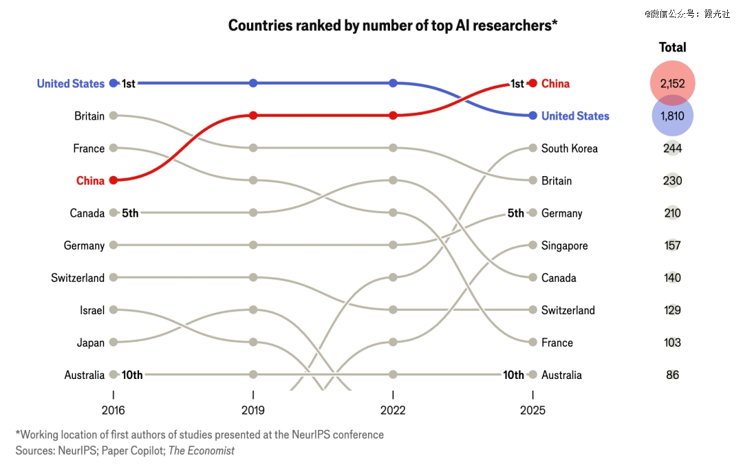 经济学人追踪了2025年12月举行的神经信息处理系统大会(NeurIPS)上发表论文的研究人员的教育背景,50%的AI研究人员在职业生涯初期来自中国(2019年仅为29%);与此同时,在美国起步的研究人员占比,则从20%下降到12%。它说明,全球AI*研究人才的来源结构,正在重新洗牌。