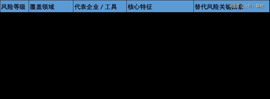 我们根据工作流的复杂度、合规要求、数据依赖性和重复性,将当前SaaS行业面临的AI冲击风险分为三类总结如下表:
