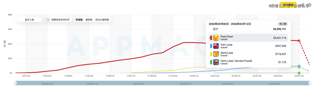 Pixel Flow及4款跟风产品的数据对比| 数据来源:App Magic,截至2026年4月8日(在百万位做四舍五入处理,数据仅供参考)
