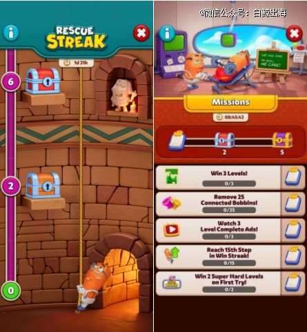 而从长期看,作为一款混休游戏,「Yarn Loop」也开始卷起了常态化运营。相较于 Pixel Flow 的 LiveOps 在游戏较晚出现(30关之后),「Yarn Loop」的 LiveOps 在游戏第 10 关之前就已出现,LiveOps 类型包括:利用 IP 角色“Streak”打造的“拯救 Streak”活动,Streak 在洞底等待救援,用户每通过一关,Streak 就能升高一层,用户由此打开宝箱获得金币奖励;还有每日任务和过关挑战等其他 LiveOps,在不断给用户新的目标和奖励,把用户的生命周期不断拉长。