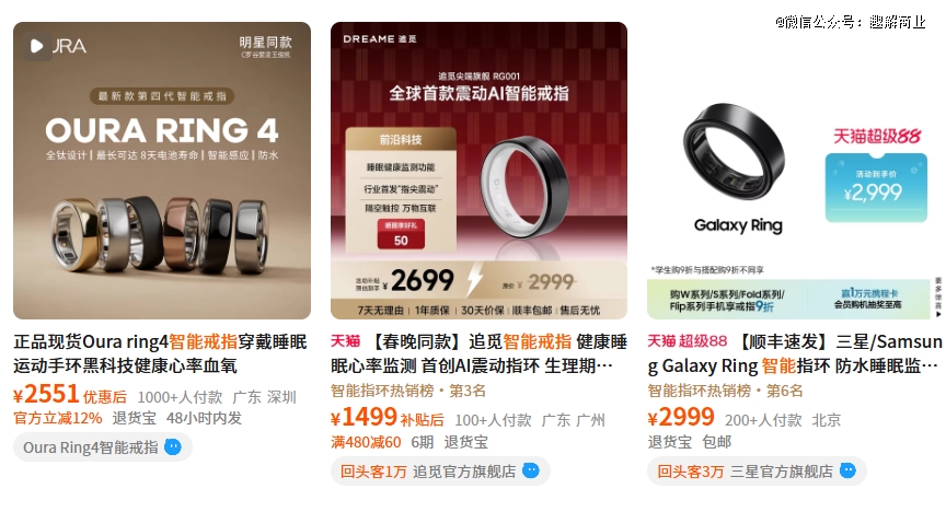 基于无感化的佩戴优势,以及Oura的成功经验,不少厂商都在这一领域迅速跟进。“趣解商业”注意到,三星、魅族、追觅、影目科技都推出了自己的智能指环,价格在1500元至3000元不等。