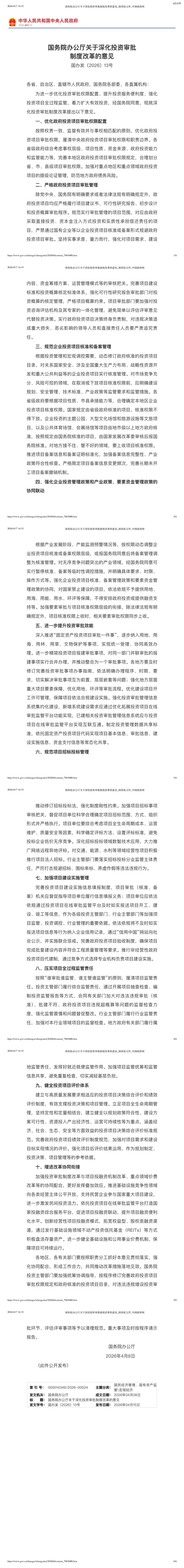 近日,国务院办公厅发布《关于深化投资审批制度改革的意见(国办发〔2026〕13号)》(以下简称《意见》)。当中引发关注的是——