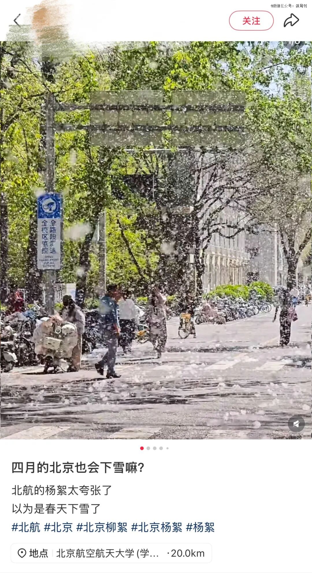 北京的四月,杨柳絮满天飞。(图/社交平台截图)