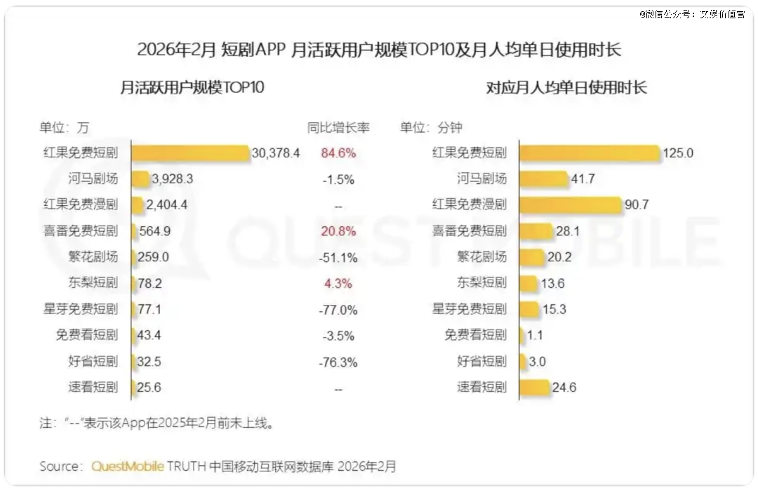即便如此,面对遥遥*的红果短剧,其他平台要想实现全方位的突围反超,是一件极其困难的事情。QuestMobile 2026短剧行业洞察报告显示,2026年2月,红果免费短剧App月活跃用户规模突破3亿大关,超过了其他短剧平台用户规模的总和,而火龙漫剧的日活规模更是尚未触及百万门槛。