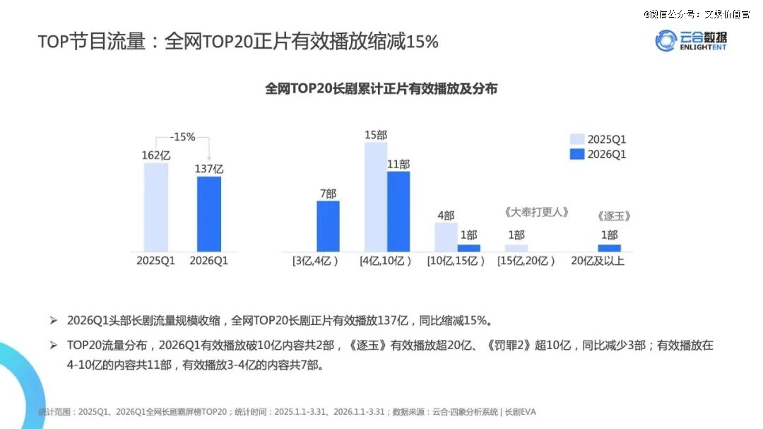 比技术更难解决的,是观众注意力的迁移。云合数据显示,2025年长剧与综艺的头部内容(TOP20)累计正片有效播放,同比分别下滑了20%和10%。2026年一季度,这两个数据再度同比下滑15%和12%。如果高质量真人长剧都难以把流失的用户拉回来,AI长剧又凭什么能做到?