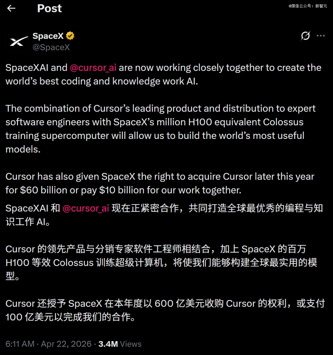 马斯克这套组合拳打下来,SpaceX、xAI和Cursor三家的命运,已经被一根线穿在了一起。