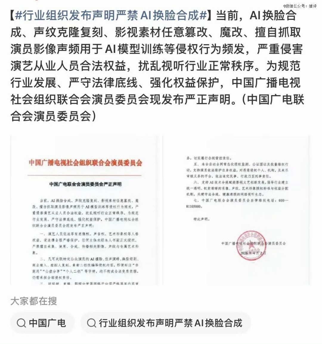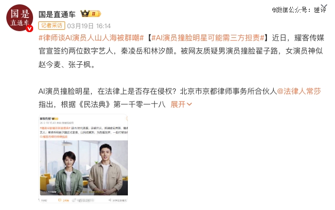 三家声明说的都是同一句话,没让你家AI用我的脸啊,别造谣。