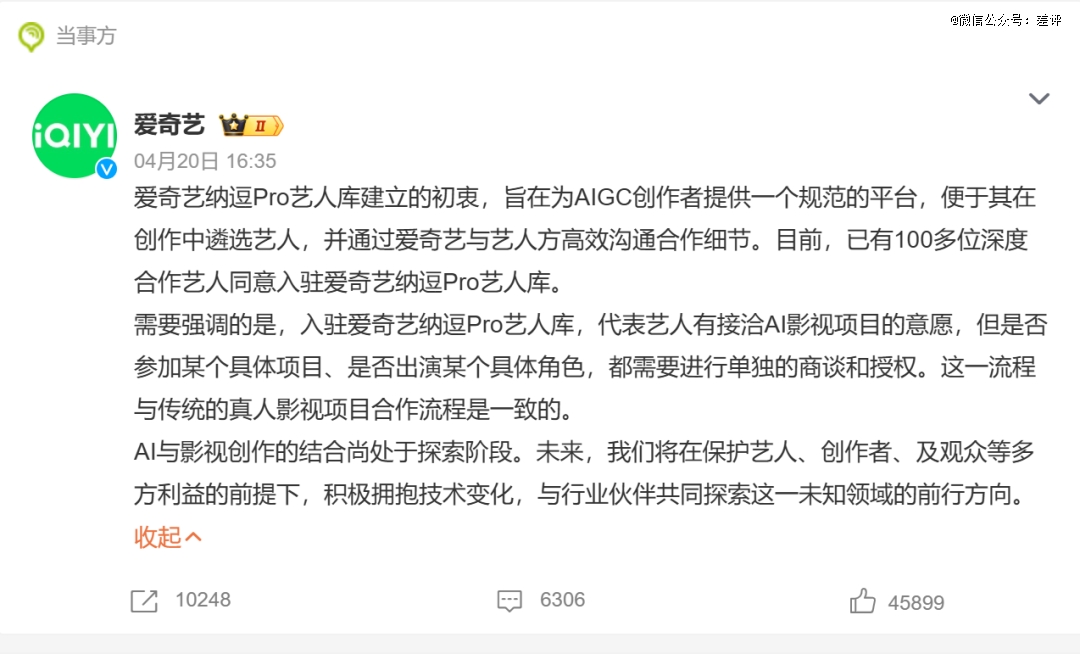 爱奇艺忍不住,好莱坞拦不住。那这还说啥了,只能说AI替代演员已经是天下大势了。