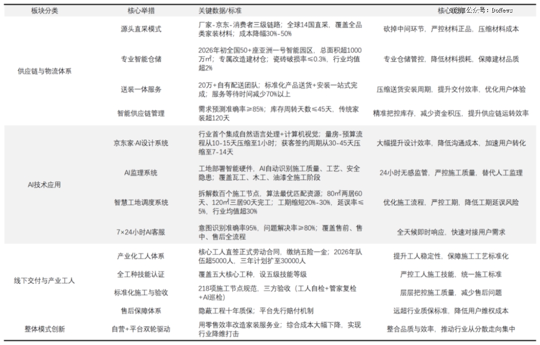 以京东为例,其依托自营与平台协同能力,一方面强化源头直采、专业仓储物流和送装一体体系,通过供应链管理提升建材品质可控性;另一方面通过AI设计、AI监理、智慧工地调度等系统,压缩从方案生成到施工管理的周期,推动服务流程更高效、更标准化。